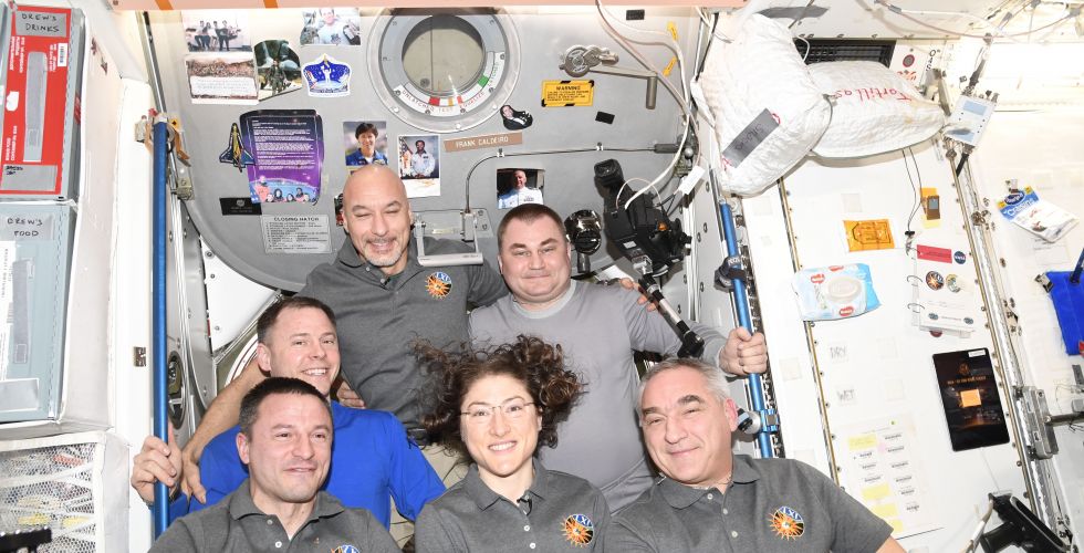 Expedition 61 Commander Luca Parmitano (front left) handed over control of the station today to Oleg Skripochka (front right). In the back row (from left) are Flight Engineers Christina Koch, Alexander Skvortsov, Jessica Meir and Andrew Morgan.