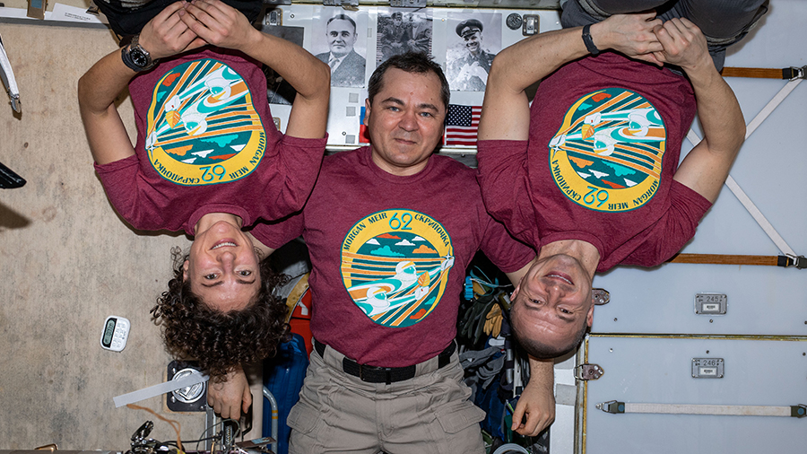 The three-member Expedition 62 crew, sporting their mission patch on t-shirts, will be living aboard the station until April. In the center, is Roscosmos Commander Oleg Skripochka flanked by NASA Flight Engineers Jessica Meir and Andrew Morgan.