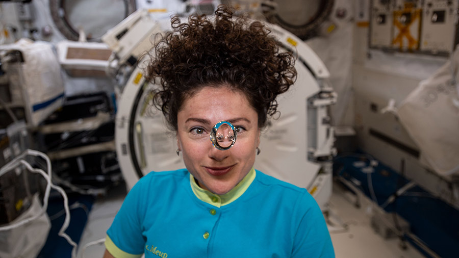 NASA astronaut Jessica Meir observes a floating sphere of water formed by microgravity.
