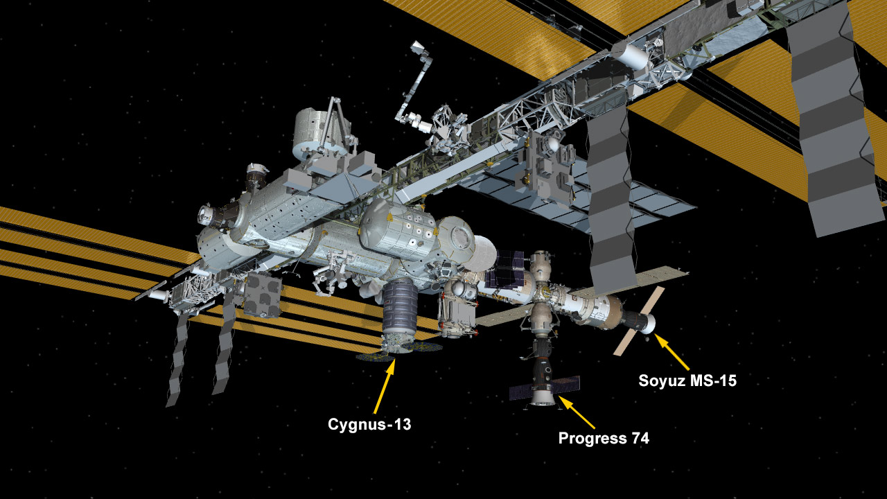 Feb. 18, 2020: International Space Station Configuration. Three spaceships are parked at the space station including the U.S. Northrop Grumman Cygnus cargo craft and Russia's Progress 74 resupply ship and Soyuz MS-15 crew ship.