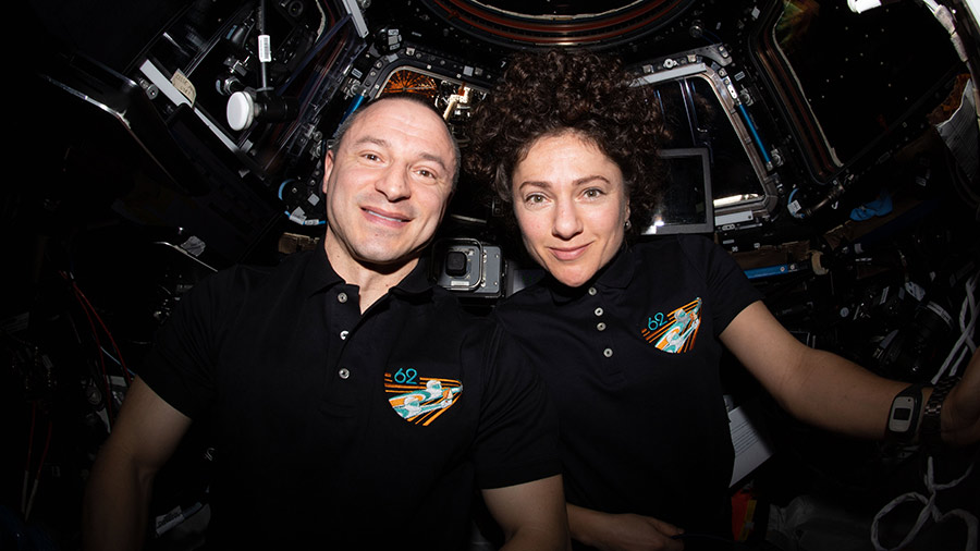 NASA astronauts Andrew Morgan and Jessica Meir pose for a portrait inside the cupola, the International Space Station's "window to the world."