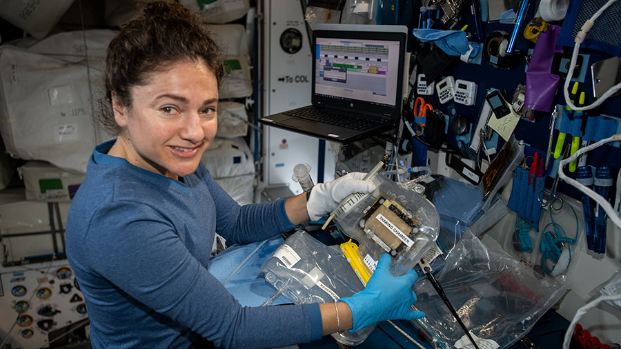 Expedition 62 Flight Engineer Jessica Meir works with research hardware to support the OsteoOmics-02 bone investigation.