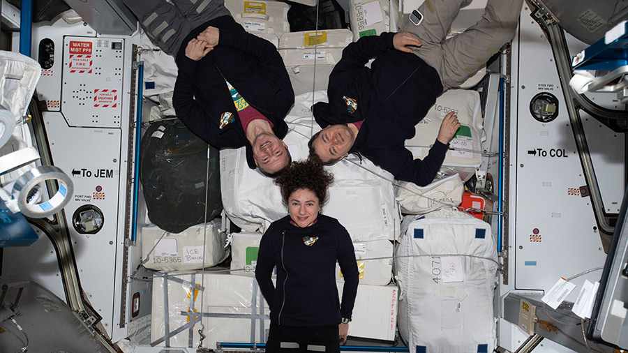 (Clockwise from bottom) NASA astronauts Jessica Meir and Andrew Morgan and Roscosmos cosmonaut Oleg Skripochka pose for a portrait inside the Harmony module.