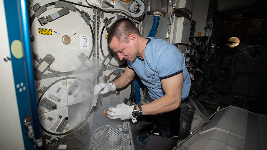 NASA astronaut Andrew Morgan retrieves gut microbe samples from a science freezer for an experiment to understand how microgravity affects microbes that impact astronaut health.