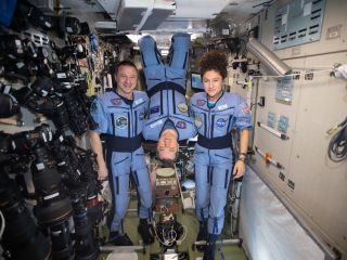 NASA astronauts Christina Koch and Nick Hague are pictured inside the U.S. Destiny laboratory module. Hague
