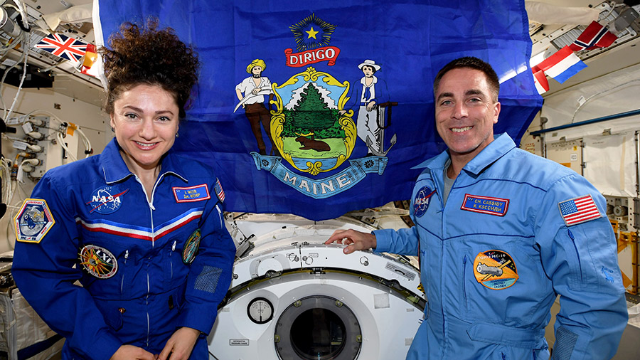 NASA astronauts Jessica Meir and Chris Cassidy pose in front of the state flag of Maine inside the Kibo laboratory module. Both astronauts' home state is Maine.