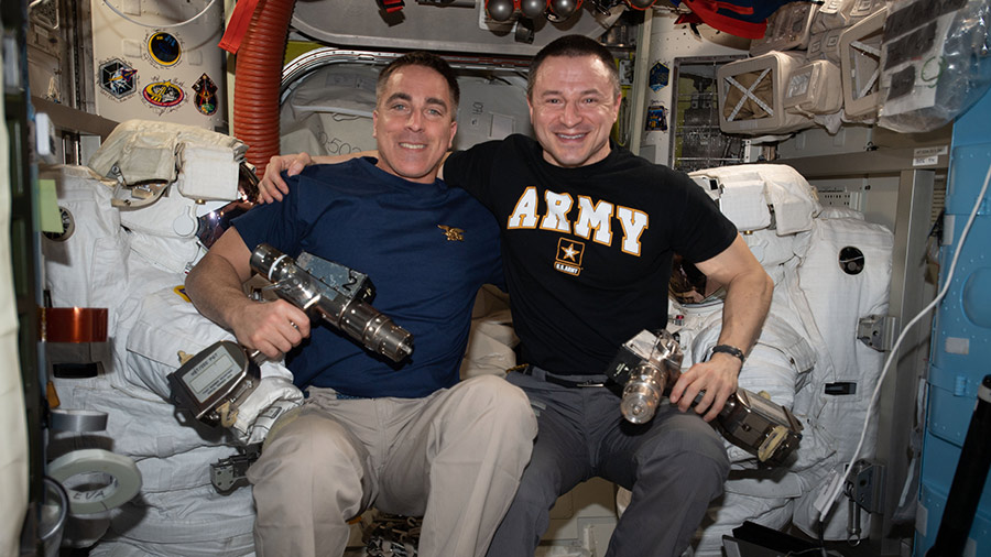 NASA astronauts (from left) Chris Cassidy and Andrew Morgan pose for a portrait inside the Quest airlock. Cassidy is a U.S. Navy SEAL and Captain. Morgan is an emergency physician and Colonel in the U.S. Army. Morgan returned to Earth on April 17.