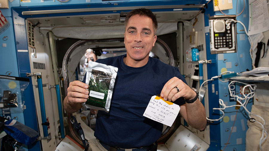 NASA astronaut Chris Cassidy holds a Parmigiana di Melanzane meal packet given to him by European Space Agency (ESA) astronaut Luca Parmitano.