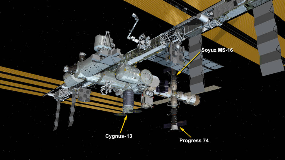 As of April 16, 2020, there are three spaceships are attached at the space station including the U.S. Northrop Grumman Cygnus cargo craft and Russia's Progress 74 resupply ship and Soyuz MS-16 crew ship.