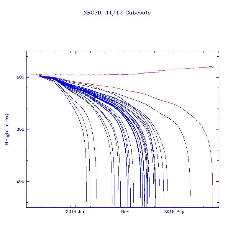34 cubesats were released from ISS in the @Nanoracks NRCSD 11 and 12 deployments in May 2017. nSIGHT (red) is the last one to reenter. ISS orbit height vs time in magenta.