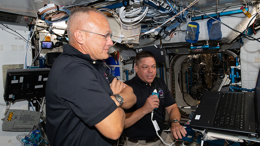 Flight Engineers Doug Hurley of NASA and Ivan Vagner of Roscosmos reviewed their support roles for the upcoming spacewalks. They will help the astronauts in and out of their spacesuits and monitor the spacewalks from inside the orbiting lab.