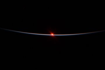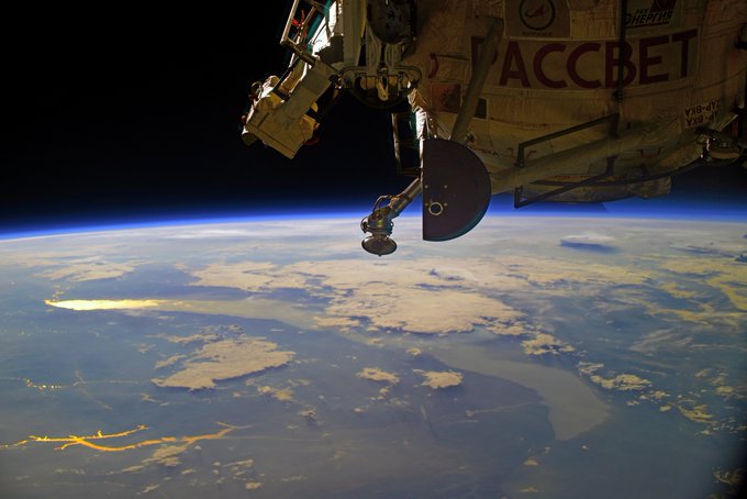#Рассвет над Байкалом! В обоих смыслах. Модуль, что виден в кадре – Малый исследовательский модуль, который еще называется «Рассвет», поэтому на фото «Рассвет» пролетает над Байкалом на рассвете :)