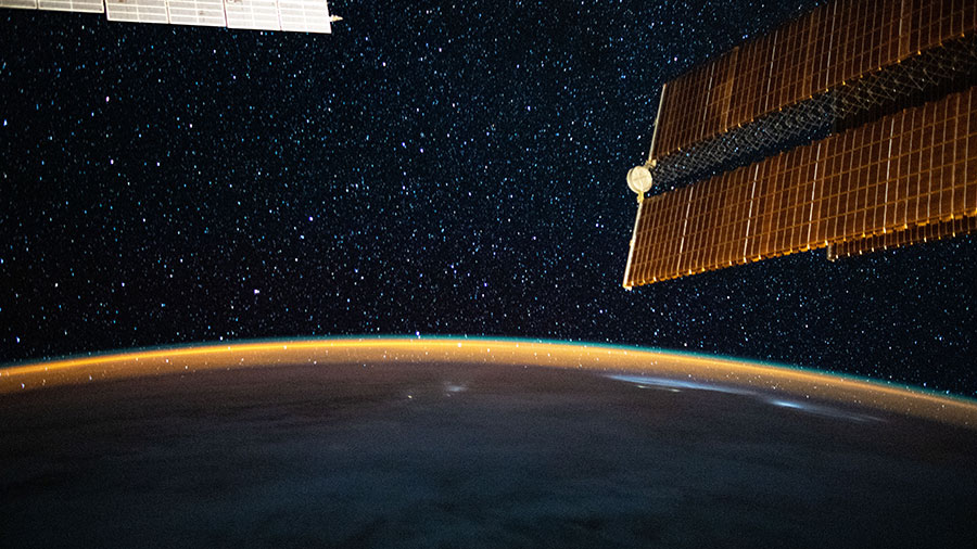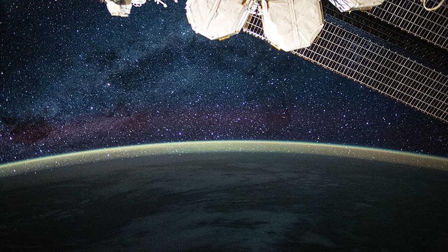 This long-exposure photograph from the station reveals the Milky Way glittering above the Earth's horizon.