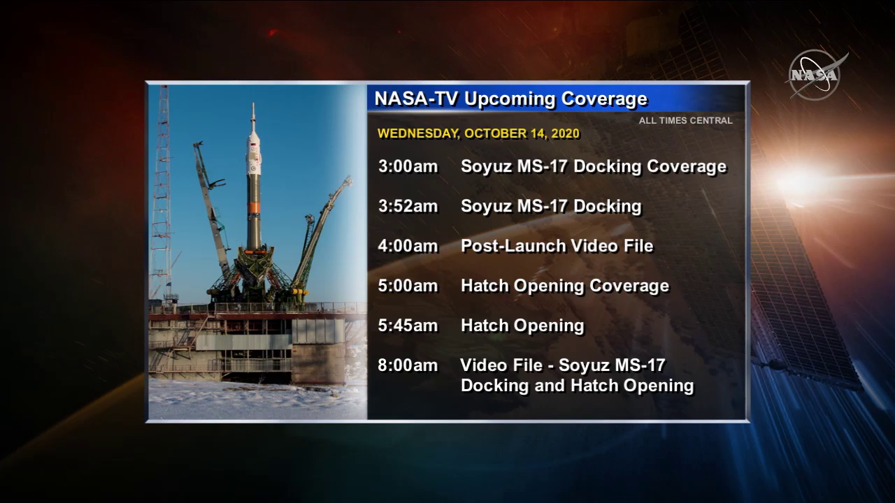 A trio of space travelers, including NASA astronaut Kate Rubins, is scheduled to launch aboard the Soyuz MS-17 spacecraft from the Baikonur Cosmodrome in Kazakhstan to the International Space Station at 1:45 a.m. EDT (10:45 a.m. Kazakhstan time) Wednesday, Oct. 14.