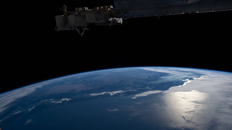 The Sun's glint beams off the Pacific Ocean and San Francisco Bay as the space station orbited off the coast of California.