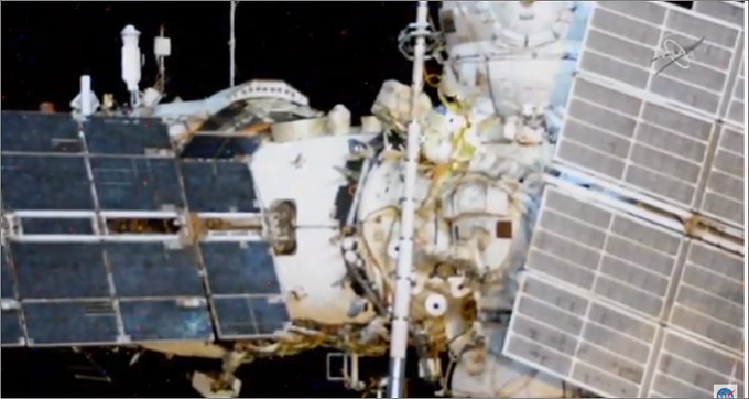 This view from @KudSverchkov's helmet cam shows his fellow spacewalker Sergey Ryzhikov as they set up the station's Russian segment for a future Russian module. https://nasa.gov/live