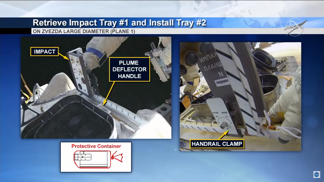 Spacewalking cosmonauts now begin removing Impakt (Impact) experiment trays: http://russianspaceweb.com/iss-vkd47.html