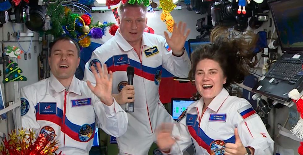 Космонавты Роскосмоса Сергей Прокопьев, Дмитрий Петелин и Анна Кикина с борта Международной космической станции спешат поздравить наступающим праздником!