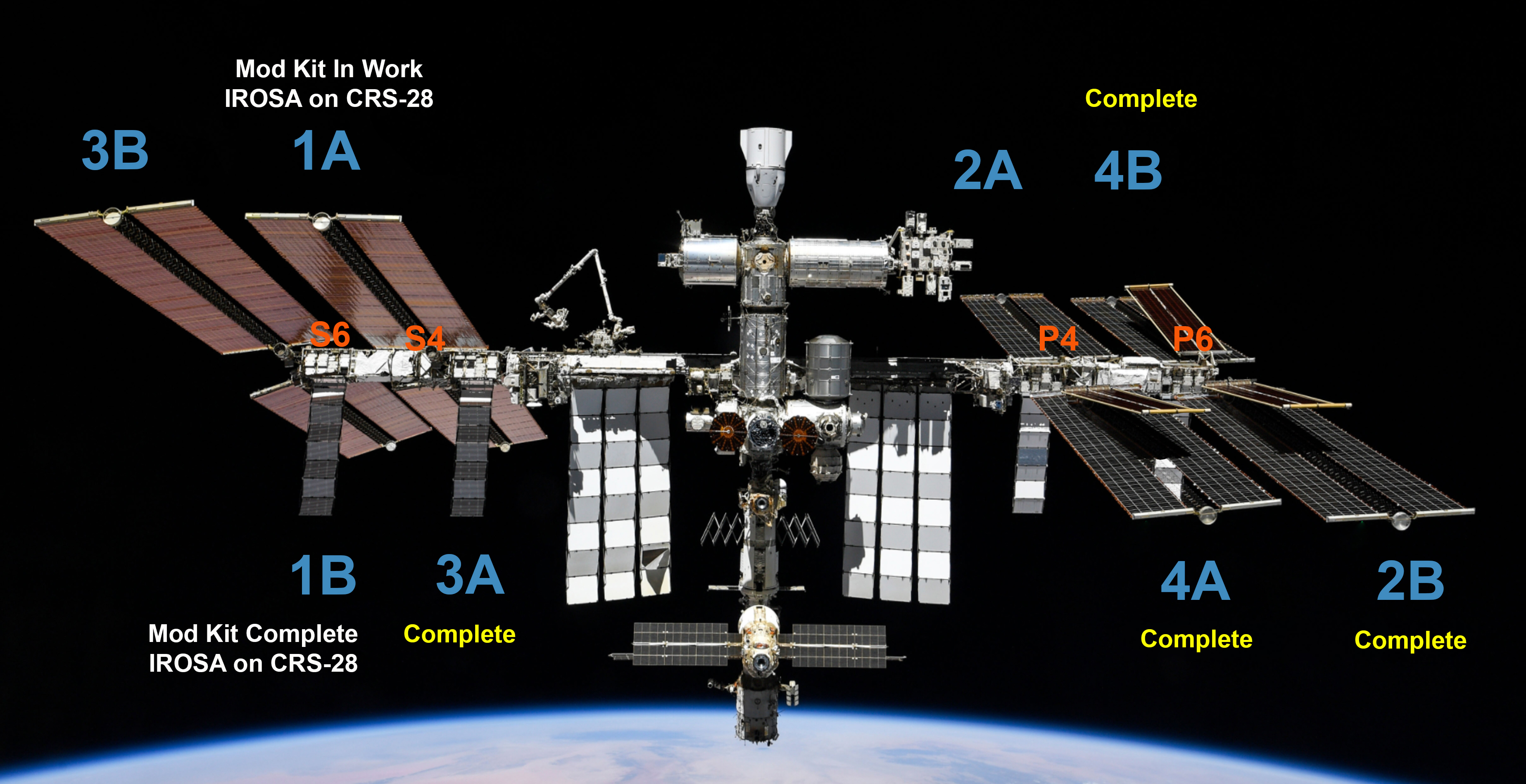 В NASA ранее отметили, что имеющиеся солнечные батареи на МКС работают нормально, но появились признаки износа: некоторые из них были установлены еще в 2000 году. Ведомство пока намерено развернуть шесть панелей iROSA, масса каждой достигает почти 340 кг, что позволит повысить мощность энергосистемы станции со 160 кВт до 215 кВт. Две из них были смонтированы в июне 2021 года. Третья и четвертая были установлены в конце декабря 2022 года. Пятая и шестая батареи, как планируется, будут доставлены на МКС на корабле Cargo Dragon в этом году.