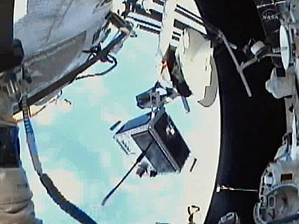 ЦитироватьCosmonaut Sergei Volkov, assisted by Alexander Samokutyaev, manually launched a small 57-pound amateur radio satellite Wednesday after a delay to assess the potential impact of a missing antenna. It appears the antenna in question, one of two on the Radioskaf-V satellite, somehow broke off, although it was not clear when that might have occurred. But mission managers decided to press ahead with the deployment anyway and Volkov released the satellite at 2:43 p.m. EDT.