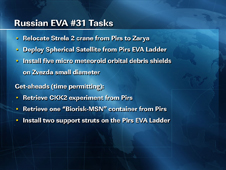 Кроме того, как ожидается, космонавты запустят микроспутник, а также установят на модуле "Звезда" дополнительные противометеоритные панели. Падалке и Маленченко также предстоит забрать с внешней поверхности стыковочного отсека "Пирс" несколько образцов материалов в рамках эксперимента "Биориск", которые находились там длительное время для изучения воздействия космической радиации, и занести их на станцию для последующей отправки на Землю.