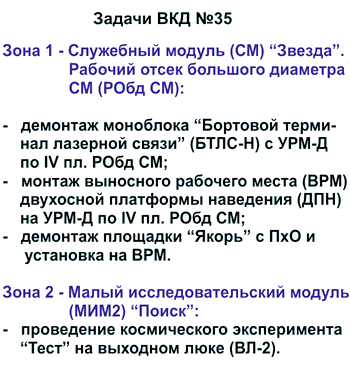 И основные задачи, события, циклограмма, зоны проведения ВКД-35 на сайте ЦУПа - http://www.mcc.rsa.ru/out220813.htm.