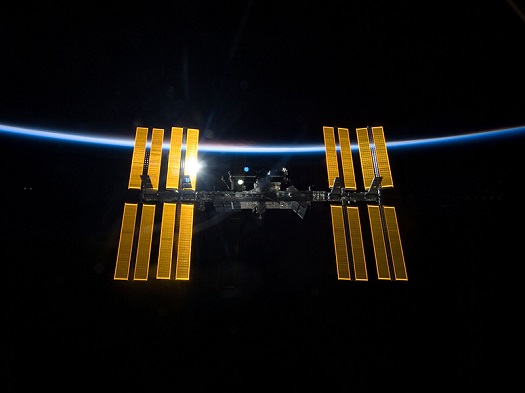 The International Space Station, backdropped by the blackness of space and the thin line of Earth's atmosphere. (Credit: NASA)