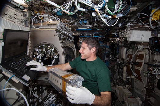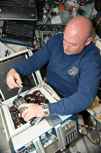 Antibiotic Effectiveness in Space (AES-1) consists of Commercial Generic Bioprocessing Apparatus and 16 Group Activation Packs. Here, astronaut Mark Kelly works with similar hardware used in the NLP-Vaccine-10 investigation. (Credit: BioServe Space Technologies)