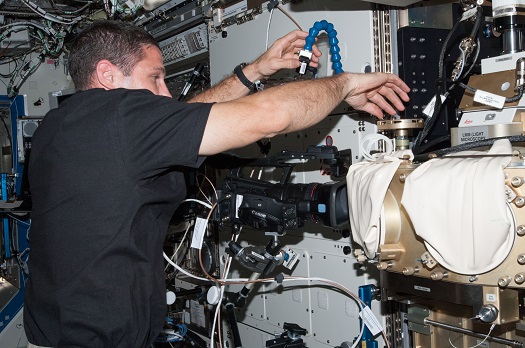 Astronaut Michael Hopkins sets up cameras to record as he works on the Fluids Integrated Rack (FIR) facility cable configuration for the Constrained Vapor Bubble-2 (CVB-2) operations. (Credit: NASA)