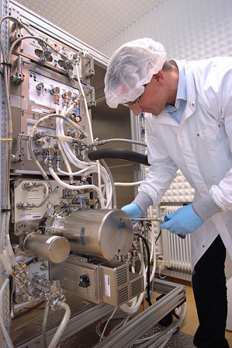 EML Electromagentic Levitator – Dennis Mitschke is fixing the Sample chamber to the Experiment module (Credit: Airbus Defence and Space)