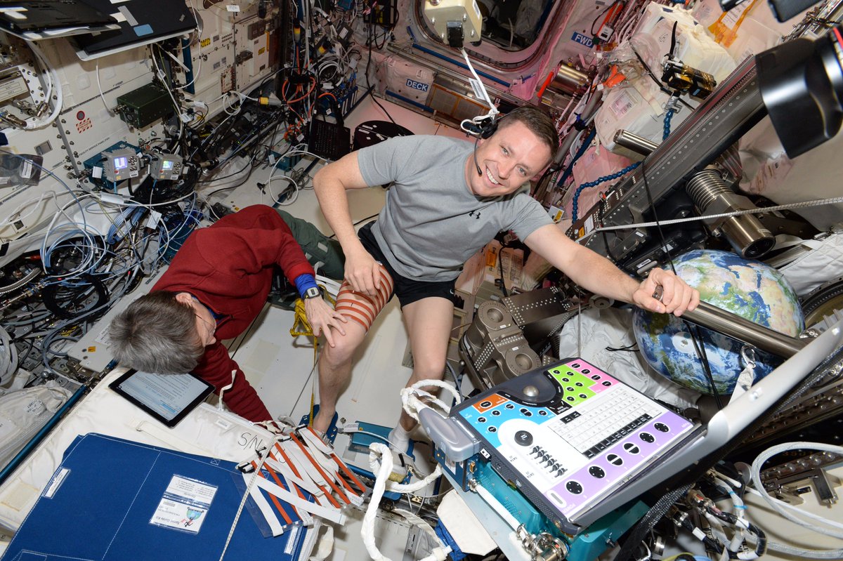 New station crew member Jack Fischer is studying how high intensity, low volume exercise may improve muscle, bone and cardiovascular health in space. He scanned his thigh and calf muscles with an ultrasound device to help doctors understand the impacts of the new exercise techniques.
