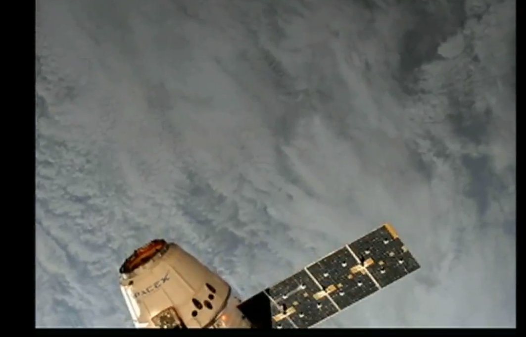 View from the SSRMS End Effector. Orbital Sunrise at 5 mins past the hour, so likely waiting until then for capture. Dragon heading to the 10 meter hold point.