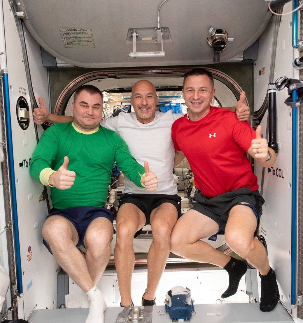 Expedition 60 crewmembers Alexey Ovchinin, @astro_luca & @AstroDrewMorgan pose for a portrait inside the vestibule between the Columbus laboratory module and the Harmony module of the International Space Station.
