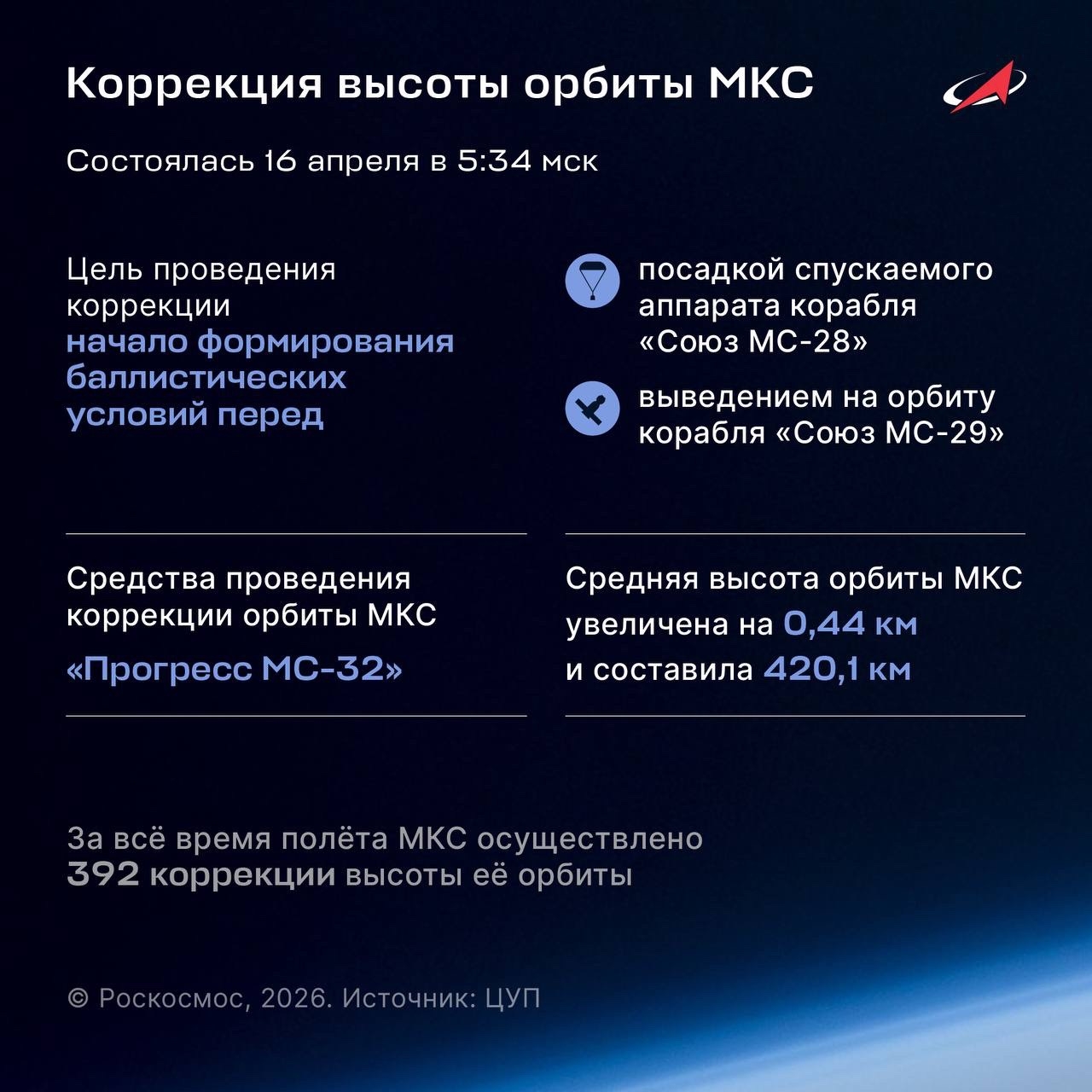 Цель этой коррекции — создание баллистических условий для прибытия «Союза МС-29» и посадки «Союза МС-28».