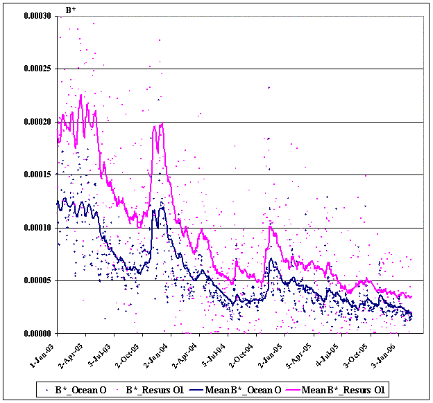 Здесь сплошными линиями обозначены средние значения В*. Как видно, кривые колеблются согласованно, значит, отношение средних коэффициентов В*  не сильно изменяется на всем временном промежутке.