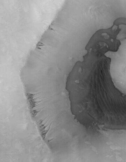 MOC image 7707 (above) shows a portion of the wall and floor of an ancient impact crater in the southern cratered terrain of Noachis Terra. The MOC image reveals v-shaped depressions on the crater wall that are characteristic of water seepage from an underground layer that is exposed in the crater walls. The image also shows a smooth, dark surface on the crater floor that might be interpreted as the remains of a pond or lake. There are two types of dark surfaces on the floor of this 50 kilometer (31 miles) diameter crater, located at 65°S, 15°W. One dark surface shows a rippled texture and is known from Viking images to be a field of windblown dunes. The other is a relatively smooth surface with "islands" of bright material within it. The boundary between the dark floor materials and the lighter materials of the crater wall suggests, by the formation of bays and peninsulas, a "ponding" relationship.