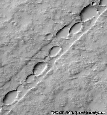 ЦитироватьThe Mars Global Surveyor's Mars Orbiter Camera (MOC) revealed a chain of elliptical pits on the lower east flank of the volcano Pavonis Mons. The pits are aligned along the center of a shallow trough -- what geologists call a "graben," 485 meters-wide. The straight trough and the pits were both formed by collapse associated with seismic faulting. The scarp on each side of the trough marks the presence of a fault. Such features are typically formed when the ground is being stretched by tectonic forces -- as when the ground is warped upward by molten rock injected into the sub-surface from deeper underground. Illumination is from the upper left in this image. Photo: NASA/JPL/Malin Space Science Systems