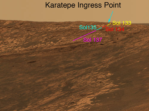 Opportunity's first target inside the crater is a flat-lying stone about 36 centimeters by 15 centimeters (14 inches by 6 inches) dubbed Tennessee for its shape.