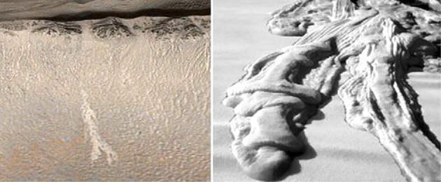 But modern satellites have spotted trickles at edges of martian craters (left panel) that look similar to icy brine flows in the Canadian Arctic (right panel), suggesting that small amounts of open water may still exist today and potentially provide a home for extraterrestrial life.