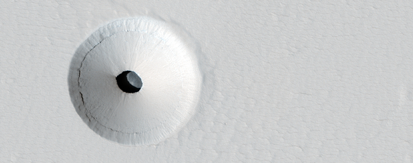 The dark spot turned out to be a "skylight," an opening to an underground cavern, that is 35 meters (115 feet) across. Caves often form in volcanic regions like this when lava flows solidify on top, but keep flowing underneath their solid crust. These, now underground, rivers of lava can then drain away leaving the tube they flowed through empty. We can use the shadow cast on the floor of the pit to calculate that it is about 20 meters (65 feet) deep.