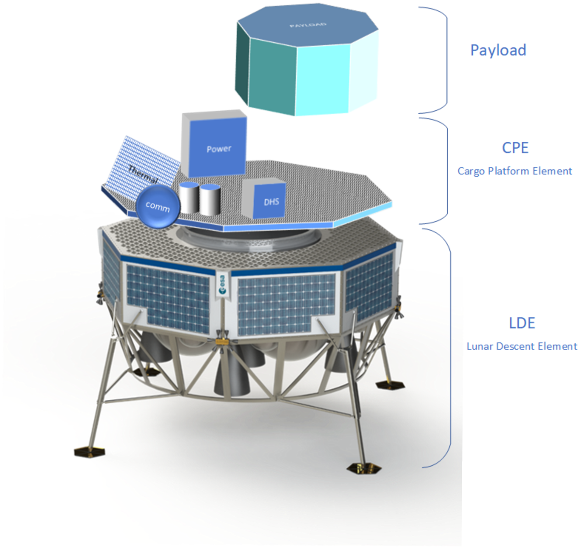 A CAD model for illustration purposes of the Lunar Descent Element is available here. Please consider mentioning ESA if any material is made using this CAD model.