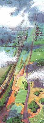 Рисунок Виктора Гребенникова вида с высоты полёта на железнодорожную станцию и общий вид гравиплана: