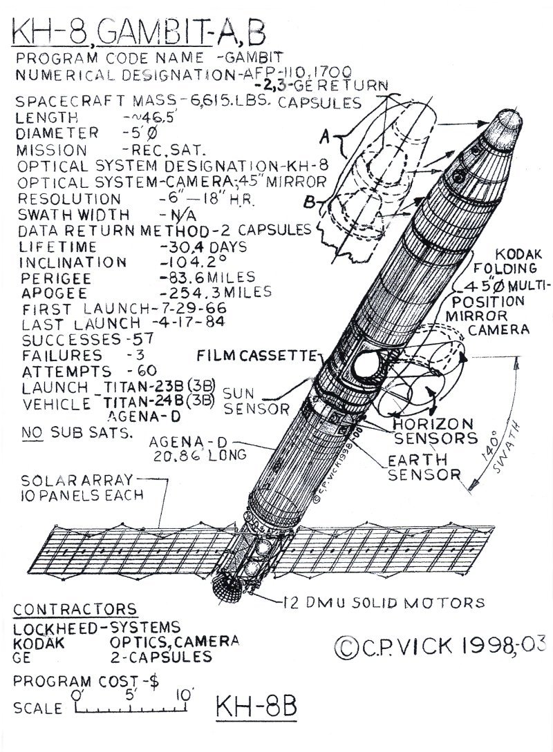 KH-8 featured two ten panel solar arrays on longer duration missions and carried 12 DMU solid motors for orbital maintenance. The spacecraft carried the usual array Lockheed of sun, earth, and horizon sensors. There is no indication that it carried any sub-satellites.