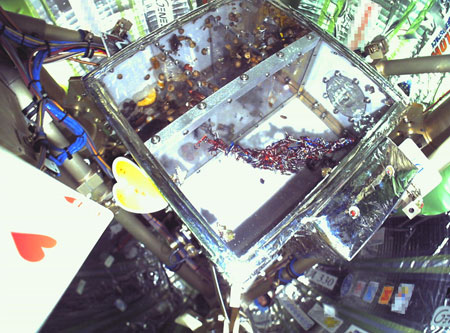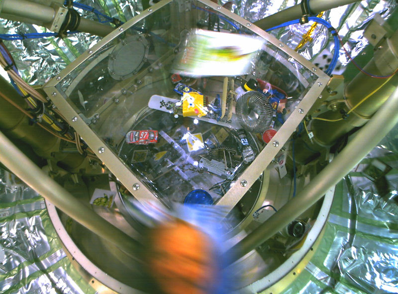 ЦитироватьThe pictured box contains Mexican jumping beans and a magnetic experiment. This small experiment consists of two electromagnets surrounded by small metal objects of varying sizes and colors. As the electromagnets are alternately activated and deactivated, the metal shapes in between form a new "sculpture" each time.