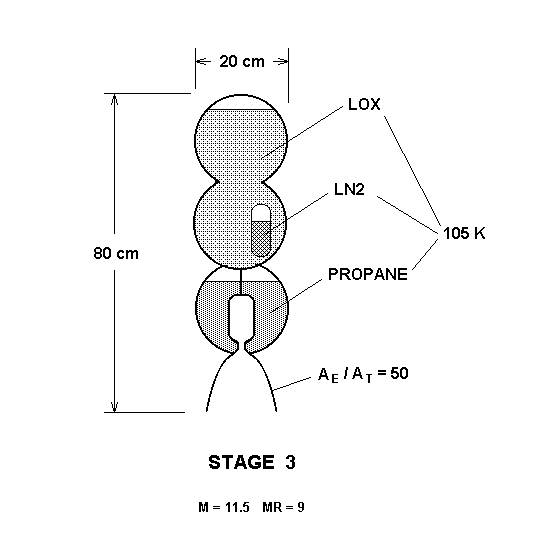 На второй ступени тяга около 0.5 - 1 кН, удельный импульс более 300 с. Наведение осуществляется системой с датчиками Солнца и горизонта Земли. Управление изменением вектора тяги. Третья ступень полной массой 11.5 кг (массовое совершенство 1/9) с тягой 100 Н и таким же удельным импульсом обеспечивает вывод ПН на отлетную траекторию.
