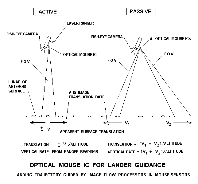 Вот на этой схеме показаны два варианта обеспечения мягкой посадки на Луну, система управления посроена при помощи четырех датчиков от оптических мышей и соответствующего софта: