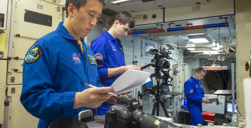 После обеденного перерыва Сергей Рыжиков, Алексей Зубрицкий и Джонатам Ким продолжили совместную работу, записав по заданию с Земли телерепортаж.