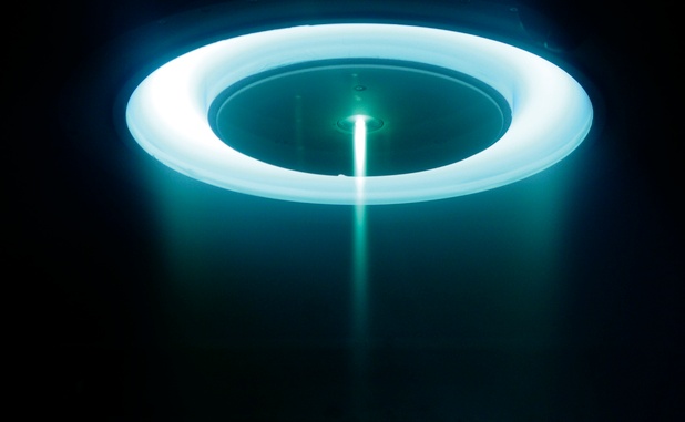 Lo's project—one of several funded by Glenn—proposes using a "high-heritage" lightweight deployable concentrator to focus solar energy on a receiver containing a working fluid that, when heated, would drive a Brayton-cycle engine to generate electricity. The electricity would power a Hall thruster (photo) to move the spacecraft. Northrop Grumman and its partners—Sandia National Laboratory and the University of Michigan—believe the approach would support a 300-kw SEP system, and are refining a concept to demonstrate the technology by using it to move a spacecraft from low Earth orbit to geostationary orbit.