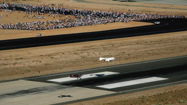 SpaceShipOne (left) glides toward a landing over some of the thousands of visitors who came to see its first civilian suborbital space flight at the Mojave Civilian Aerospace Test Center on June 21, 2004. CREDIT: AP Photo/Pool, Jim