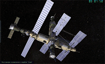Также после стыковки "Кристалла" можно перевести на него (с базового блока) обзорную камеру - в этом случае связка "Мир"-"Буран" хорошо центруется на экране.